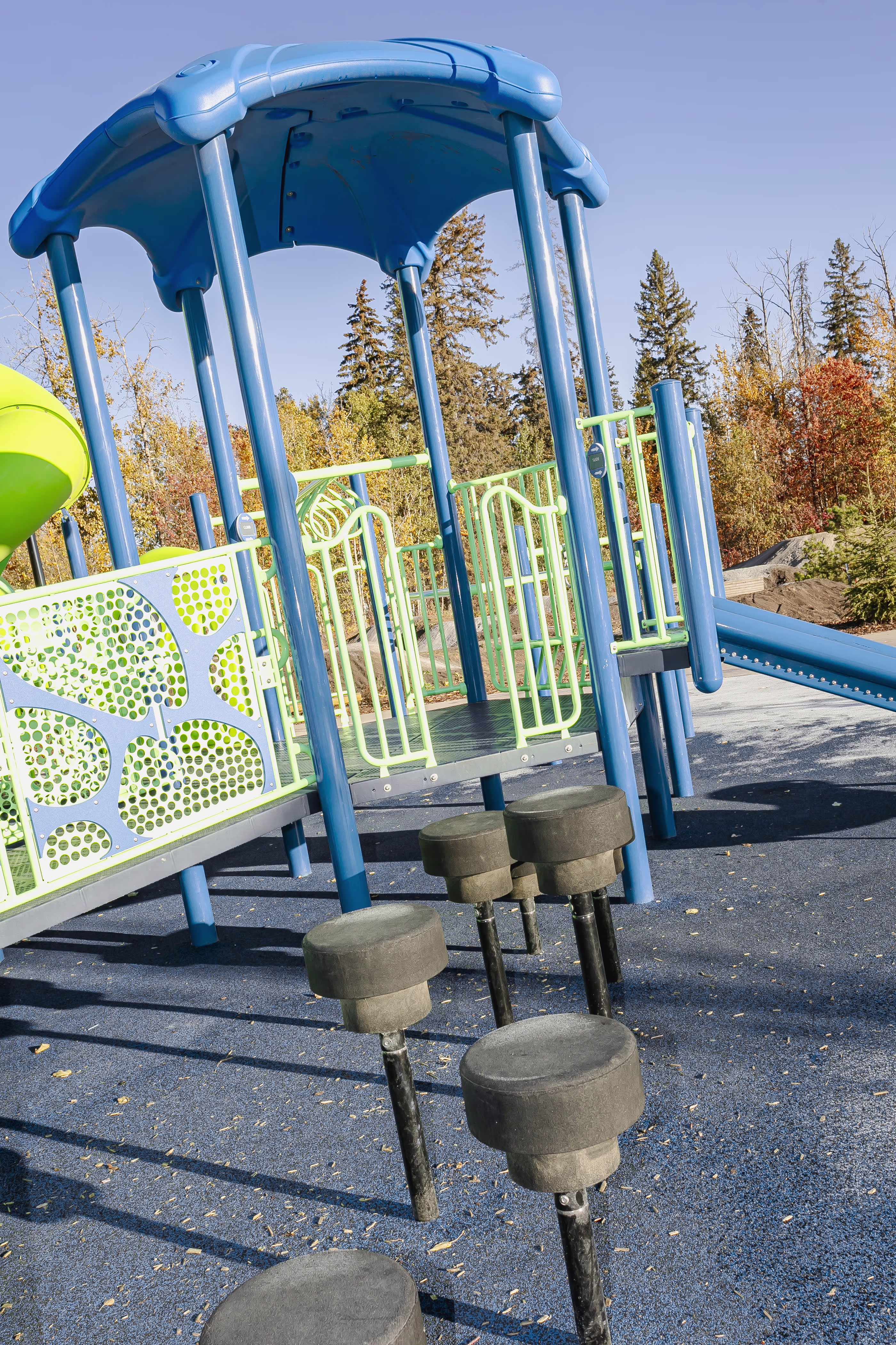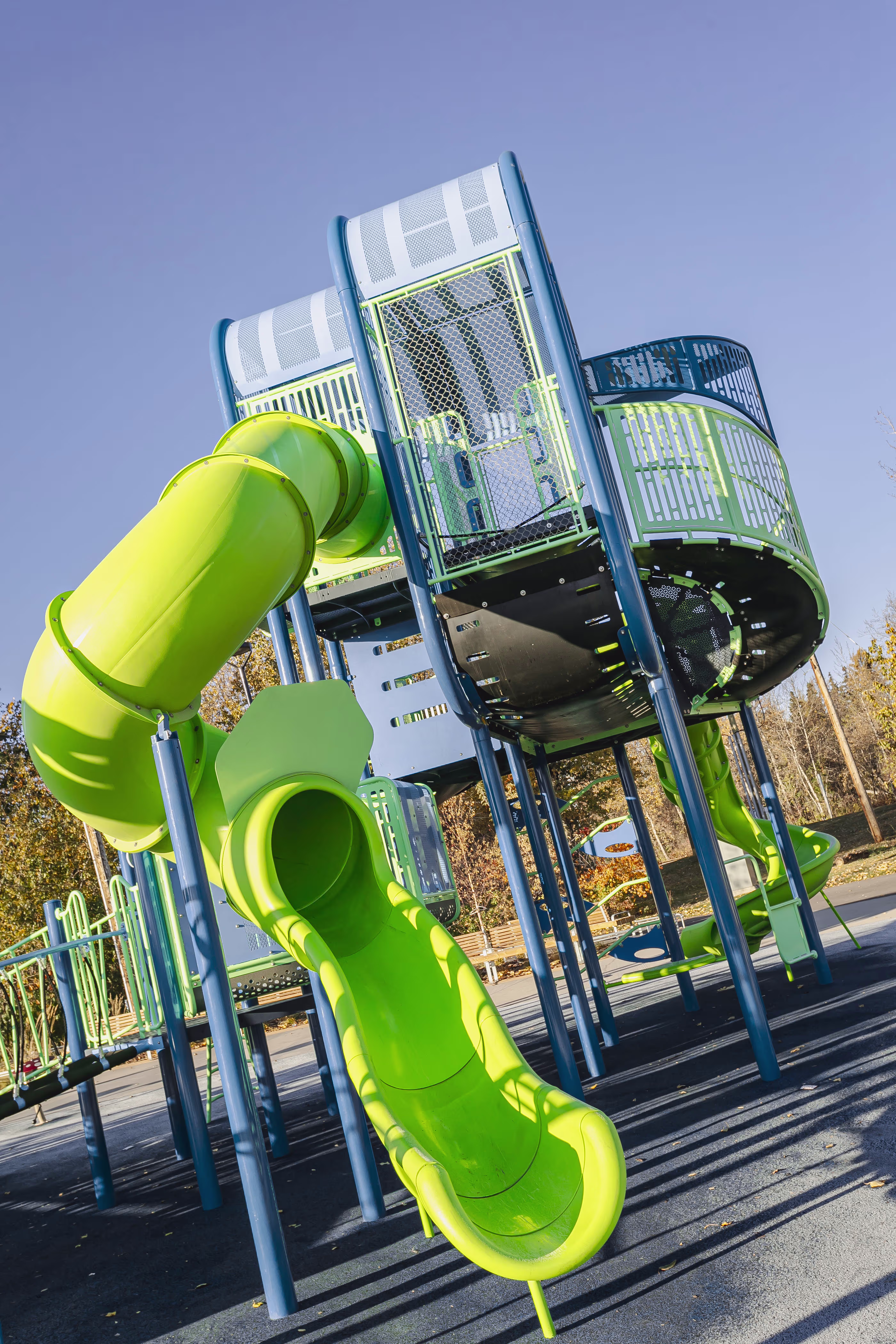"The inclusive playground is bright, unique and inviting! The slide tower is unlike any we’ve found in the capital region and my daughter complimented the design. It offers users several ways to get up to the top level – including a spiral ramp. There are two huge, twisty slides as well as a roller slide. (Roller slides are an inclusive feature for a number of reasons. They offer a sensory experience, are often wider to allow parallel play, and remove static electricity making them safe for users with cochlear implants." - Jill from Edmonton Playgrounds