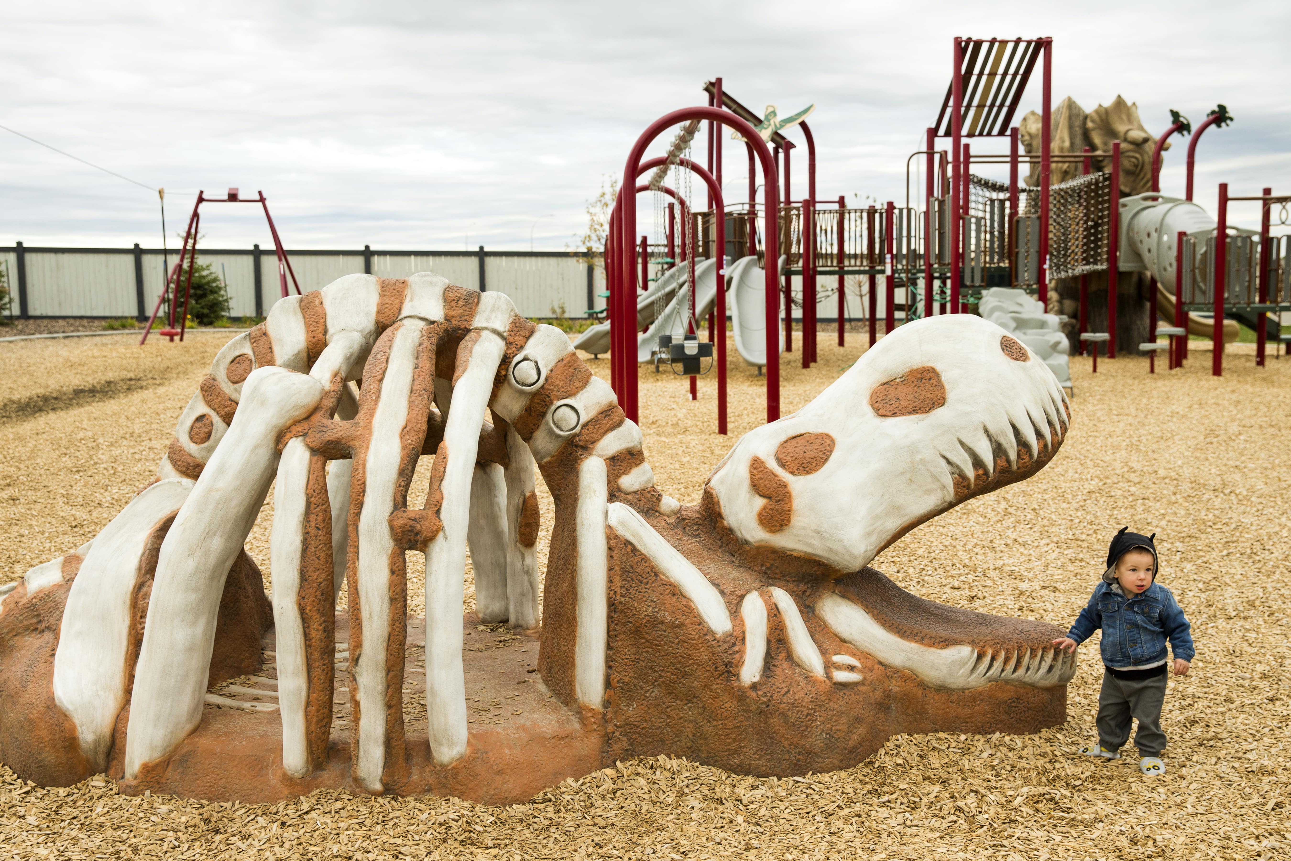 There is a tot and senior play area each with a structure, an archaeological sand table with buried fossils waiting to be discovered, and a zip-line (the first playground zip-line installed in Alberta).