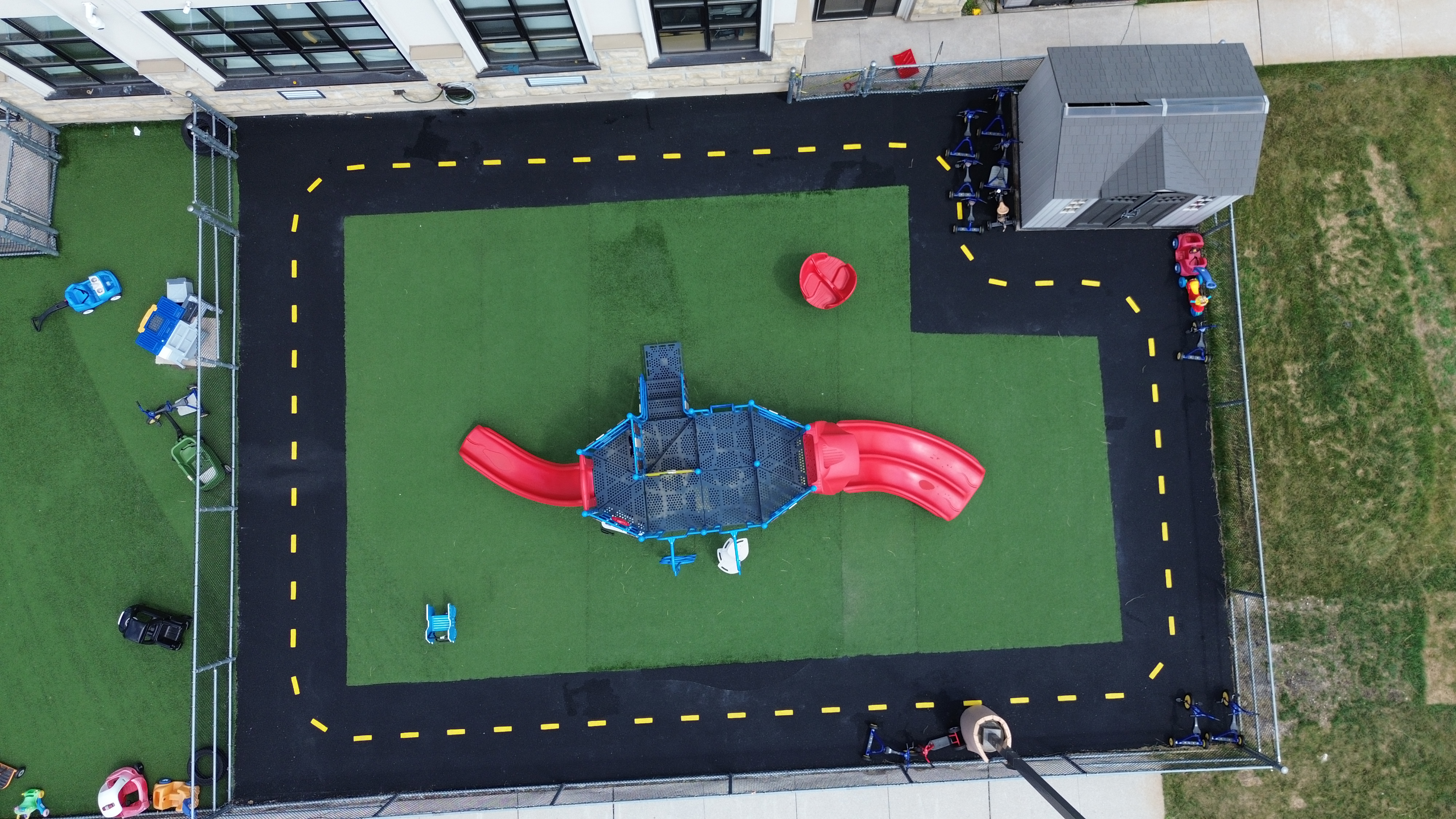 The outdoor play space at Noah’s Ark Daycare in Richmond Hill, ON was thoughtfully designed to support early childhood development through active, imaginative, and social play. This compact yet functional play environment includes a colourful play structure with dual slides, climbers, and interactive play components that encourage balance, coordination, and confidence-building for young children. The artificial turf surfacing provides a clean, low-maintenance, and safe play area, while the surrounding trike path promotes gross motor development through movement play. Secure perimeter fencing and accessible layouts ensure a safe environment for daily outdoor play.
